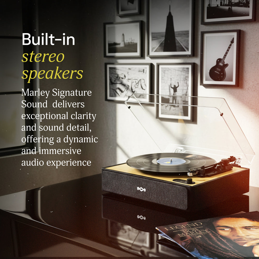 Explore our turntable with speakers collection and become part of the House of Marley family. Embrace music and sustainability, letting Bob Marley's legacy live on with every spin of your cherished vinyl collection. Connect your turntable to external, eco-friendly speakers or stream vinyl records wirelessly via Bluetooth transmitter, and savor the rich sound of your cartridge and tonearm as your vinyl comes to life.